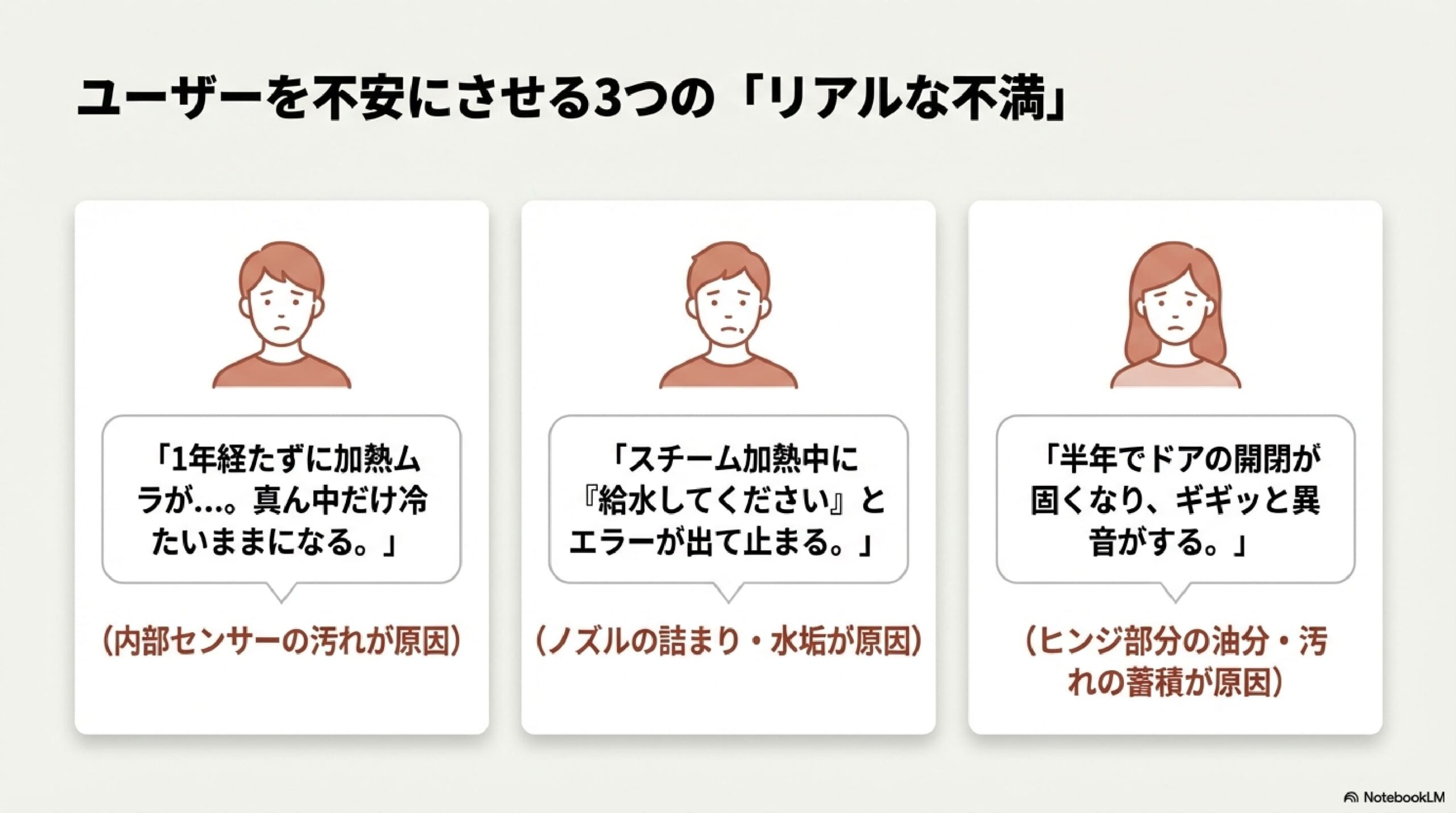 特にスチーム機能付きのモデルでは、内部センサーの汚れや温度補正の誤差が原因で温まりにムラが出ることが多いようです。