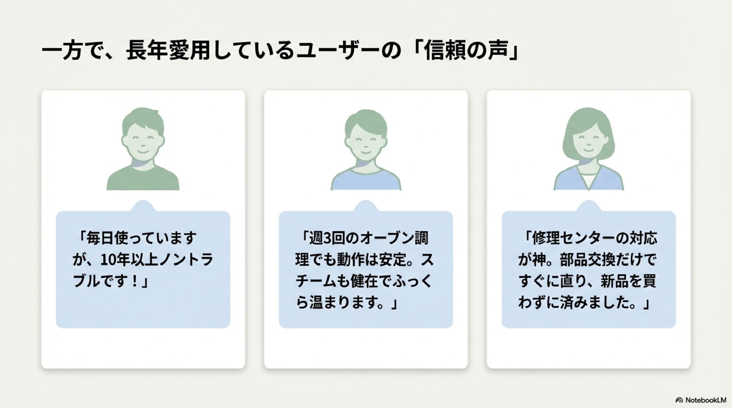 定期的に掃除をして、通気スペースをしっかり確保しているユーザーほど、耐久性の高さを実感しているようです。