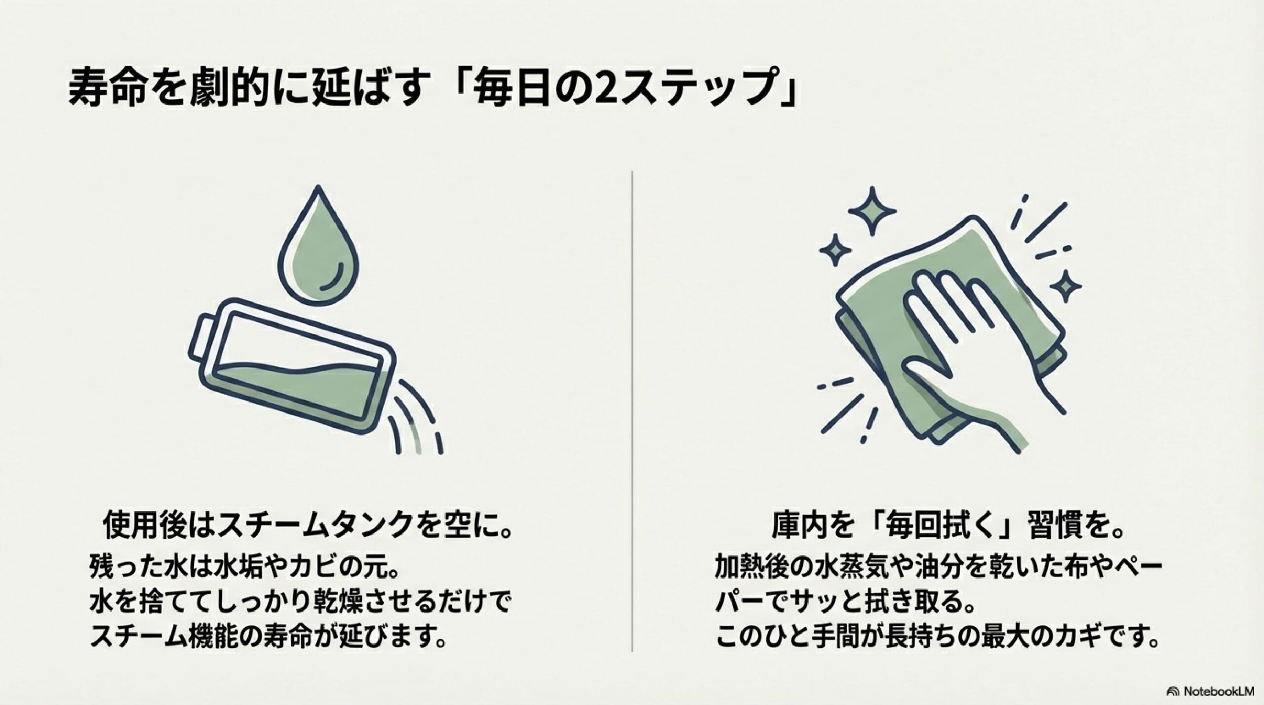 スチームタンクの掃除や庫内拭き取りなどの簡単な習慣で、5年以上、場合によっては10年近く長持ちさせることも可能です。