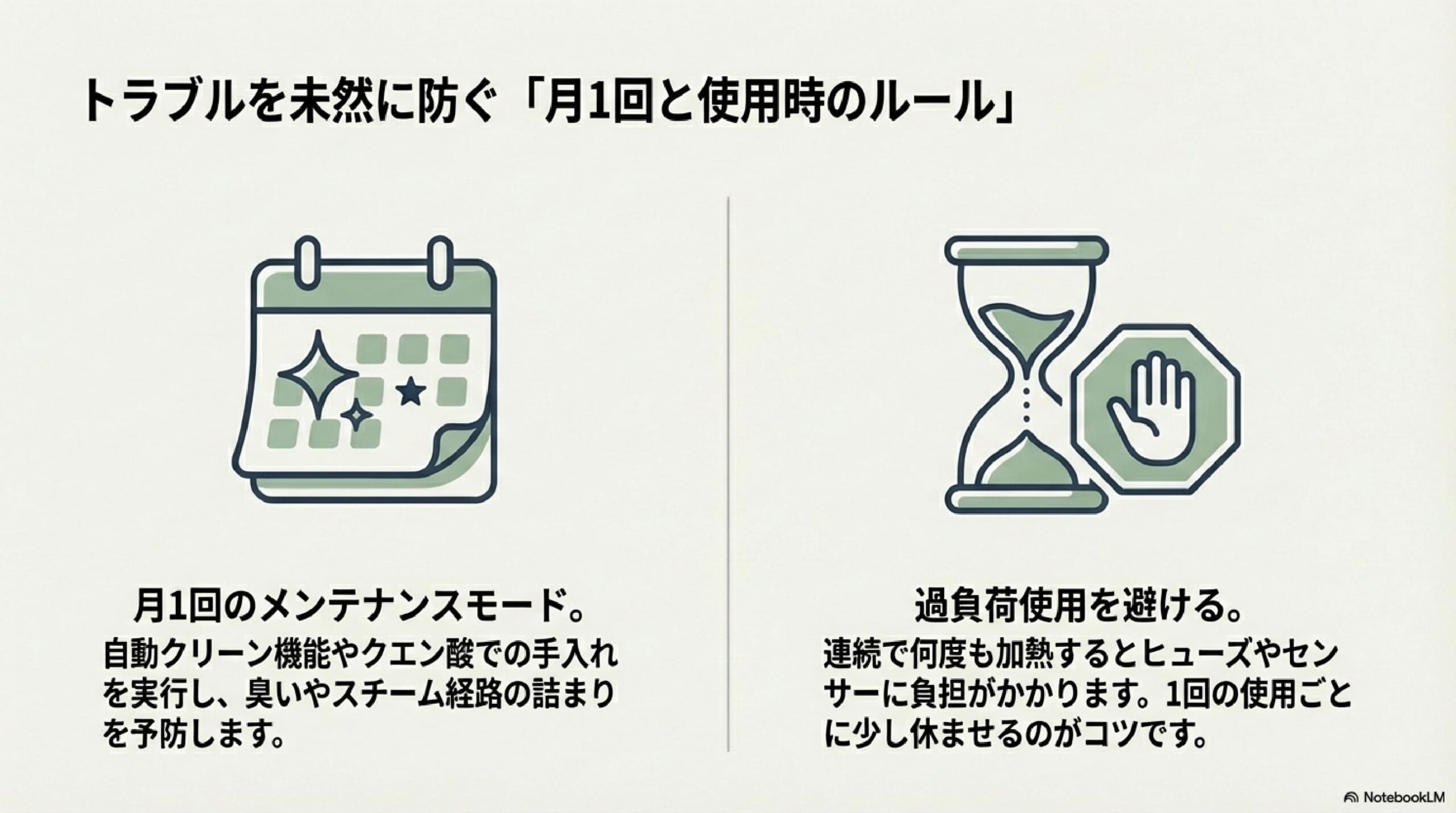 定期的なタンク洗浄やスチーム経路の乾燥を習慣にすれば、長期間快適に使えるようになります。